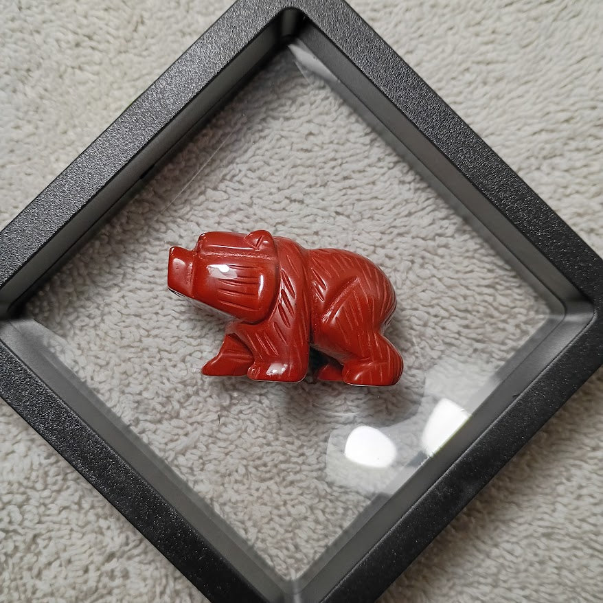 This hand-carved red jasper bear radiates grounding energy and symbolic power, captured mid-stride in a striking display of natural strength. Encased in a floating frame that gives the illusion of levitation, this piece blends earthy beauty with spiritual meaning. Red jasper is known for its stabilizing energy, often used for protection, courage, and ancestral connection. The bear—an ancient symbol of endurance and fierce guardianship—adds an extra layer of totemic significance. Whether for your altar, a collector's shelf, or as a meaningful gift, this floating display brings bold energy to any space.